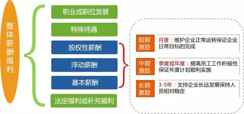 公司激励的体系应该考虑公司基层、中层和高层不同层次的需求,有效的激励结构是短中长三者结合全面激励体系,如下图所示。