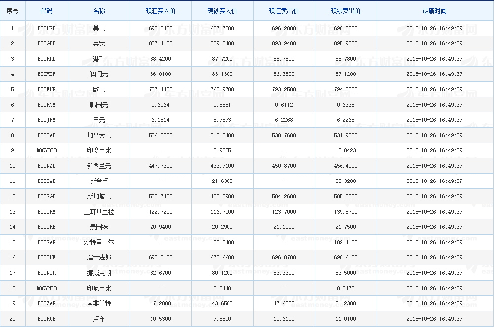 中国银行外汇牌价 2018-10-26(图片来源:东方财富网)