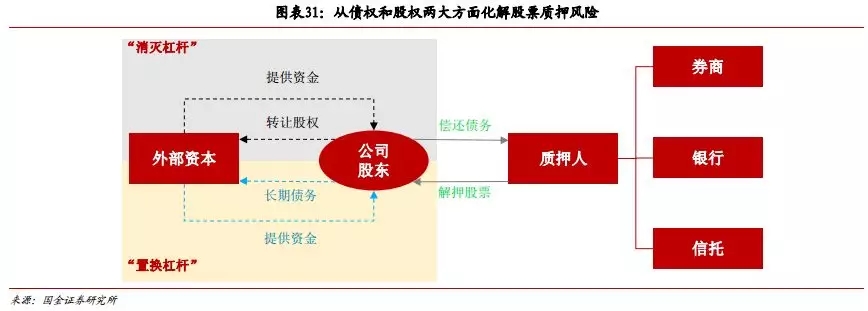 间接:场内质押资金有两大来源:1)券商自有资金;2)券商资管资金。从2017年的数据来看,自有资金和资管资金比重 在1:1左右。而券商资管资金中有大部分资金来自于银行。
