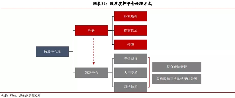 为了防范违约风险,质押方会通过逐日盯市的方式,设定相应的警戒线和平仓线。低于警戒线时融资人需要进行补充质押, 低于平仓线时质押人有权处置质押股份。一般来说,警戒线和平仓线分别为 150%和 130%(也有分别设置为 160%、140%)。