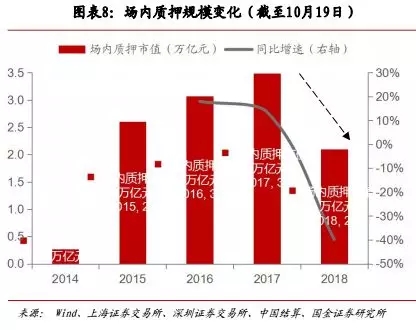 2018年“场内质押”规模由3.49万亿大幅下降至2.10万亿,“场外质押”规模由2.66万亿下降至2.20万亿。