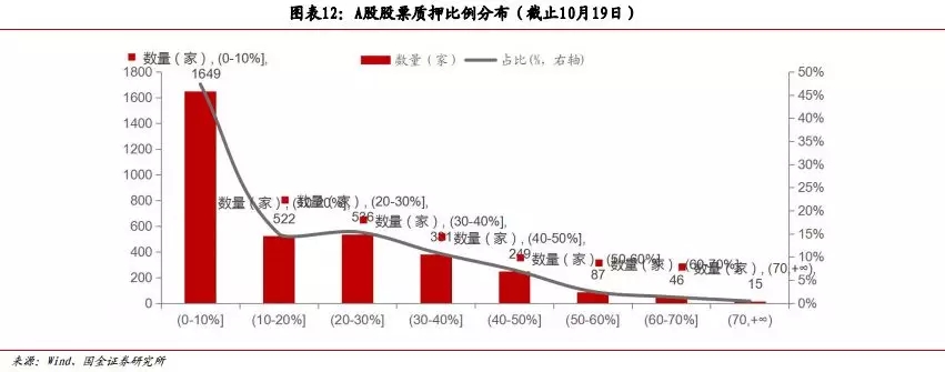从质押比例的分布来看,目前A股中质押比例低于10%的股票最多,共有1649只,占比为47.33%。质押比例超过50%的个股有147只,占比为4.22%,质押比例超过70%的个股有15家,占比0.43%。