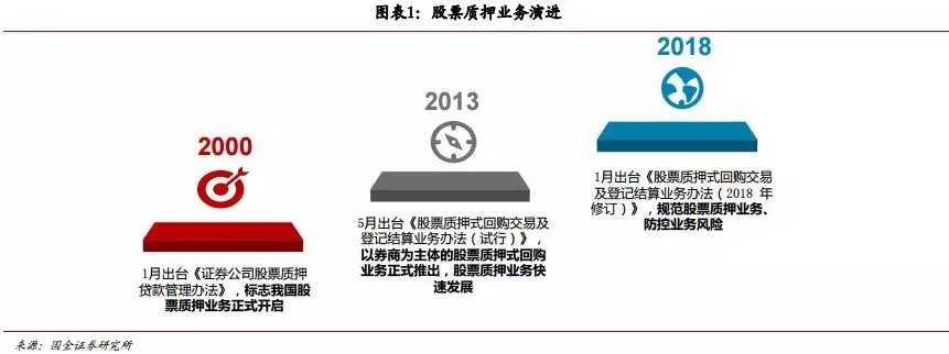 我国股票质押业务起源于2000年,以《证券公司股票质押贷款管理办法》的发布为标志。随着2013年5月《股票质押式回购交易及登记结算业务办法(试行)》的发布,以券商为主体的股票质押式回购业务正式推出,此后我国股票质押业务进入了快速发展阶段。