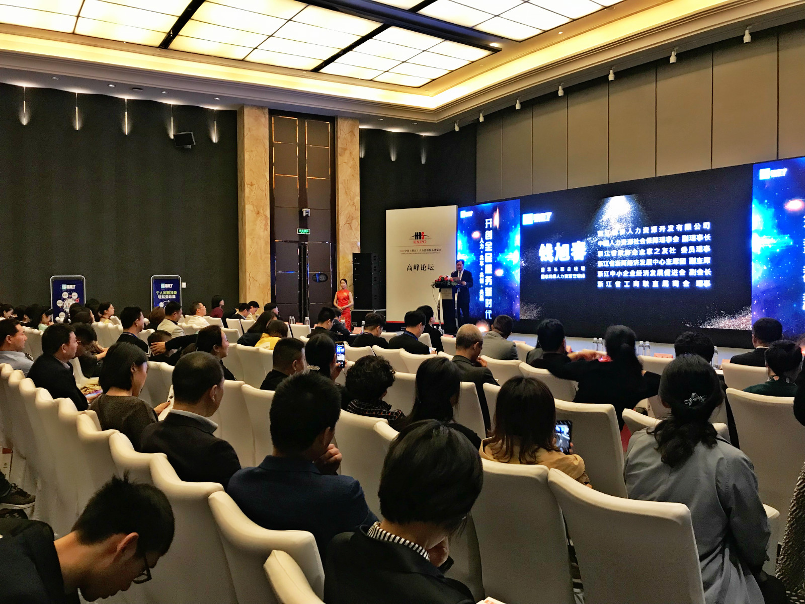 浙江人博会分为论坛和展览两部分同时进行,由浙江省人力资源和社会保障厅主办、浙江群桥人力资源开发有限公司和浙江梭转网络科技有限公司联合承办的《开创全民服务新时代——人力·共享·共创·共赢》主题高峰论坛在洲际酒店上海厅同步举行。
