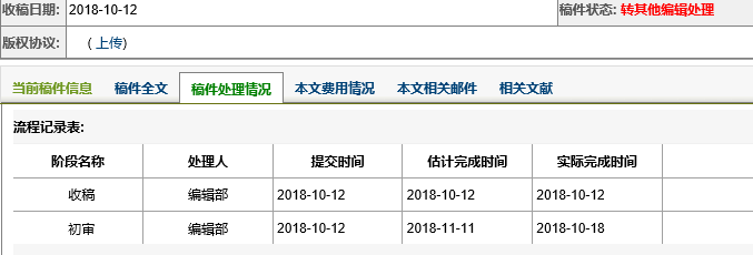 学报投稿处理状态显示“转其他编辑处理”