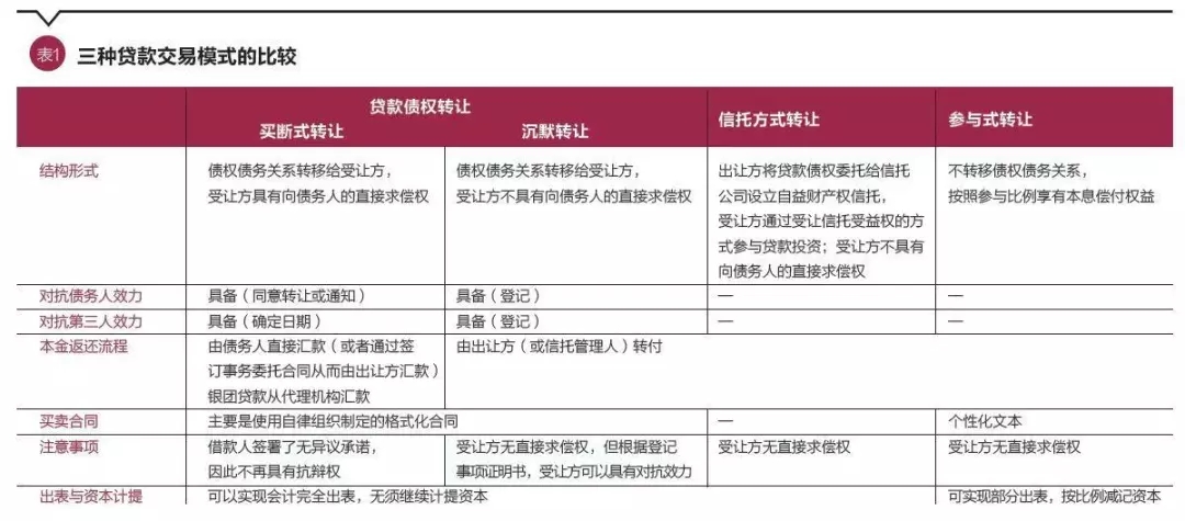 贷款债权转让(Assignment):是指出让方将债权资产及其对应的附属权益全部转移给受让方,贷款出让后,贷款受让方与债务人之间存在直接的债权债务关系。按照是否通知债务人,贷款债权转让又可分为买断式转让(Outright Transfer)和沉默转让(Silent Transfer)两种方式。债权转让交易中,债权转让合同成立,仅对出让方和受让方有约束力,对于债务人来说,并不必然发生效力,当然这并不影响债权出让方与受让方签署的债权转让协议的效力,即不影响受让人取得债权。为确保转让行为对债务人发生效力,一般来说,贷款债权转让会选择通知债务人,买断式转让就是采用了这种安排。而沉默转让则是通过转让登记的方式获得对抗效力:1998年,日本发布了《动产与债权转让特例法》,明确债权转让可以在不通知债务人的情况下,通过办理转让登记的方式取得第三方抗辩权,沉默转让方式就是在这种背景下发展起来的。在实践中,贷款债权转让是最主要的贷款流转交易模式。其中,银团贷款由于采用了格式化的合同文本等因素,标准化属性更强,代理行的设置也使得债权确认、资金转付等事宜容易办理,因此银团贷款大多采用了贷款债权买断式转让的方式。而双边贷款转让中,由于通知债务人或征求债务人较为不便,因此大多数双边贷款转让都采用了沉默转让的方式,日本三菱东京日联银行开展的债权转让业务中80%是通过沉默转让的方式进行的。