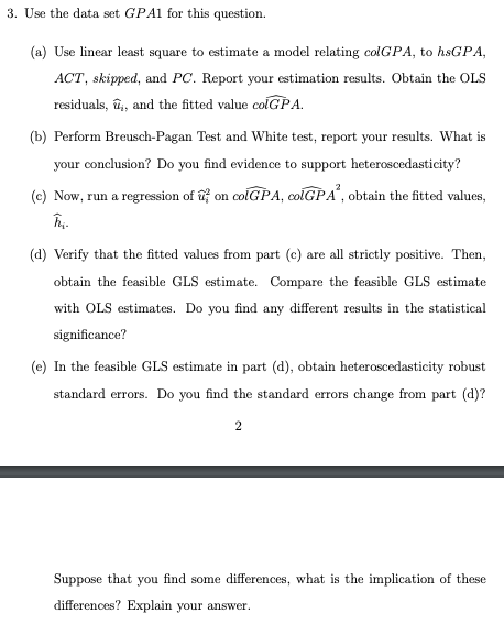 (a)使用最小二乘法估计colGPA与hsGPA,ACT,skipped和PC相关的模型,报告您的估算结果。 获得OLS残差u(hat)以及拟合值colGPA(hat)。