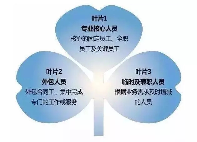 爱尔兰管理学作家查尔斯·汉迪在其《非理性时代》一书中提出了三叶草组织型态,形容企业应由三组迥然不同的人员组成:一是专业核心人员,包括专业、技术、管理员工,是企业生存发展的基础,其绩效与报酬息息相关;二是外包人员,企业将非核心工作外包给外包商或个人,以集中发展核心业务,外包人员领取服务费;三是临时及兼职人员,企业可根据业务需求及时增减人力,临时人员除了提供传统的初级劳动力外,也可能提供经验丰富且创造能力的人力,如顾问、财务人员等。“三叶草式组织”被看作未来组织的人员构成模式,只有三分之一核心员工,负有管理及协调其他临时员工的责任。你可以考虑一下,这种员工组织构架对贵公司是否在商业运作上有帮助,对你的团队有帮助?如果你的组织能更像三叶草形态,你可以节省多少运作成本?