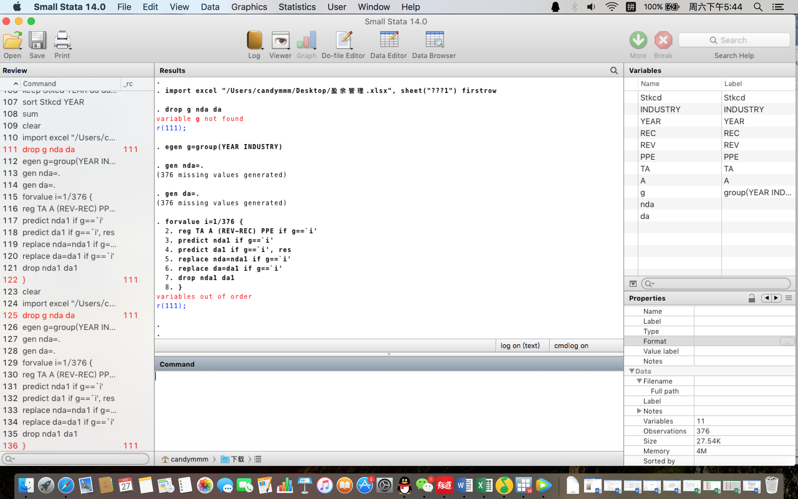 求助!!!!大三小白写论文的时候用到修正琼斯模型,第一次用stata,一直在报错,希望大神可以指点一下,万分感谢!!!希望大神能帮忙解释一下含义~尤其是那个forvalue i=1/376这里是数据的数量吗?