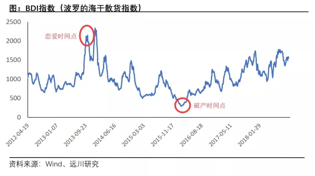 从图中我们可以看出,李云峰和徐若瑄相识的时候,正好处于航运业景气高点,而没过多久,航运景气度就随着欧债危机和中国经济低迷,一路走低,到了2016年4月,传出了李云峰公司破产的消息,此时正好是行业周期低点。