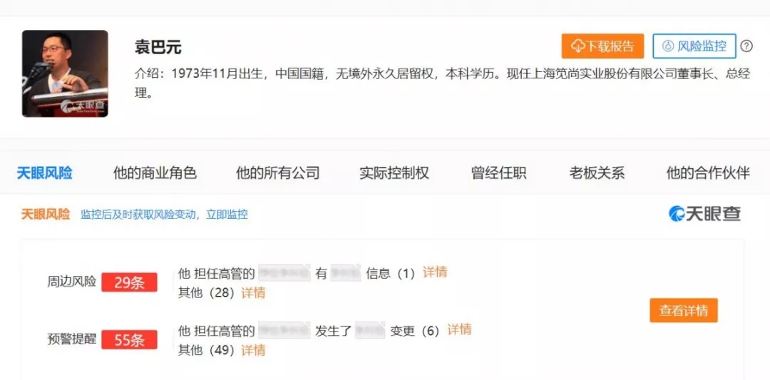 以张雨绮为例,她最近的一段婚姻失败,其实跟没有做好婚前调查有很大的关系。比如袁巴元这个人的所有信息,其实都可以用商业安全工具“天眼查”来查询得到,以下是“天眼查”上袁巴元老板详情页的截图,信息应有尽有。