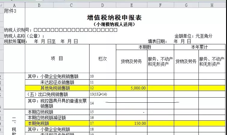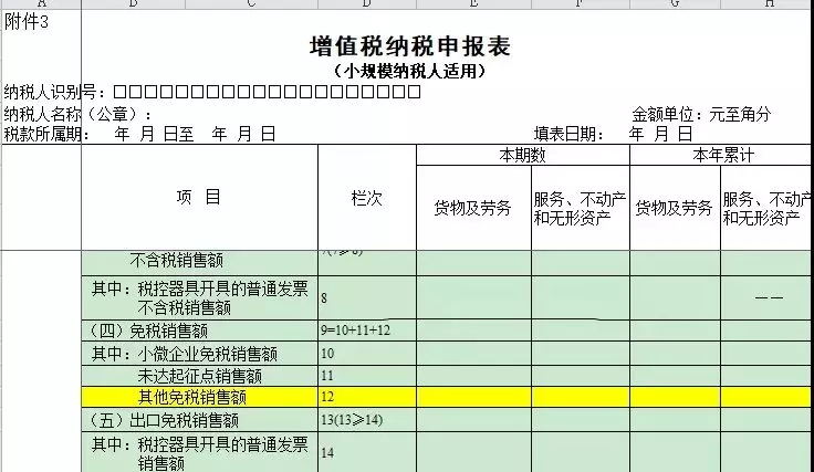 《增值税纳税申报表(小规模纳税人适用)》第12栏“其他免税销售额”:填写销售免征增值税的货物及劳务、应税行为的销售额,不包括符合小微企业免征增值税和未达起征点政策的免税销售额。