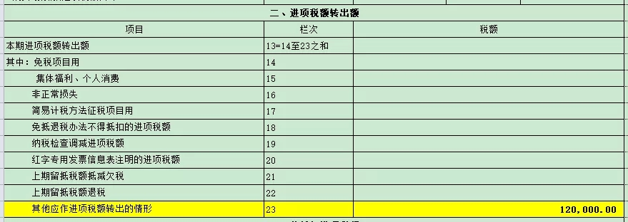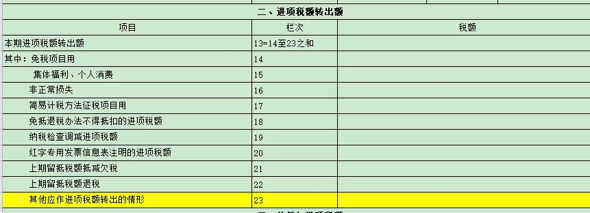 第2、3栏“其他应作进项税额转出的情形”:反映除表中14-22项进项税额转出情形外,其他应在本期转出的进项税额。