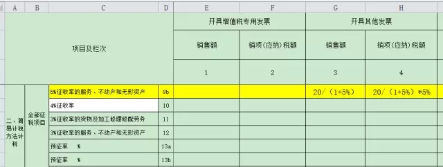 A公司是一般纳税人,本月停车费收入20元,撕扯的是定额发票,适用简易计税的,申报时候进行价税分离填入第3至4列“开具其他发票”,
