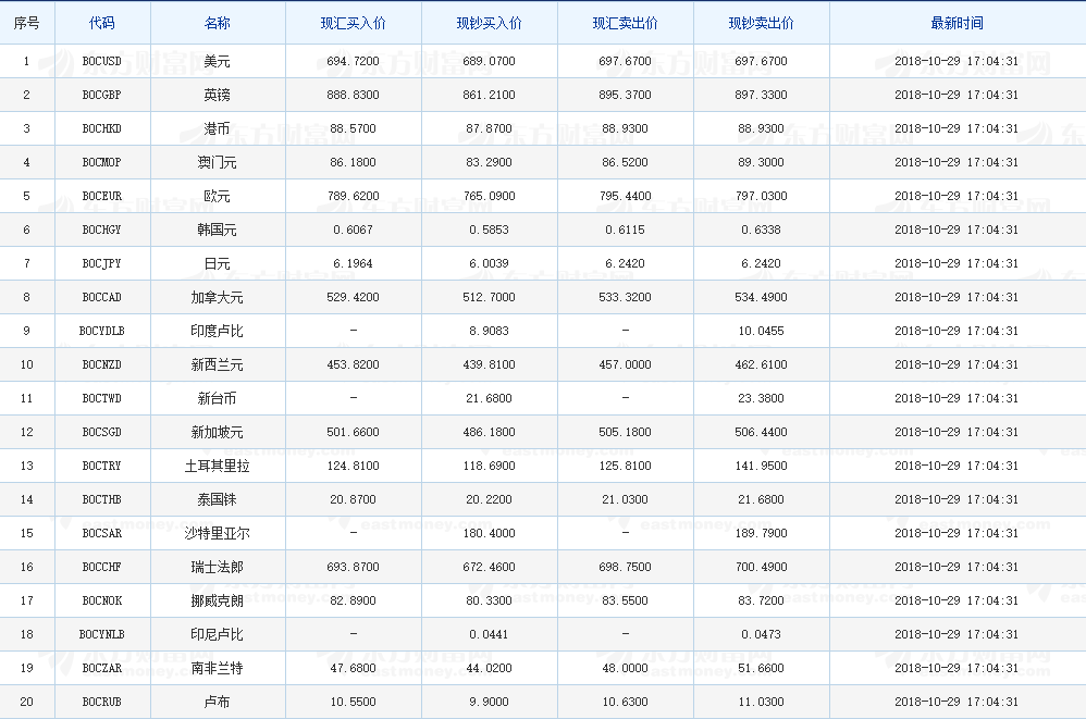 中国银行外汇牌价 2018-10-29(图片来源:东方财富网)