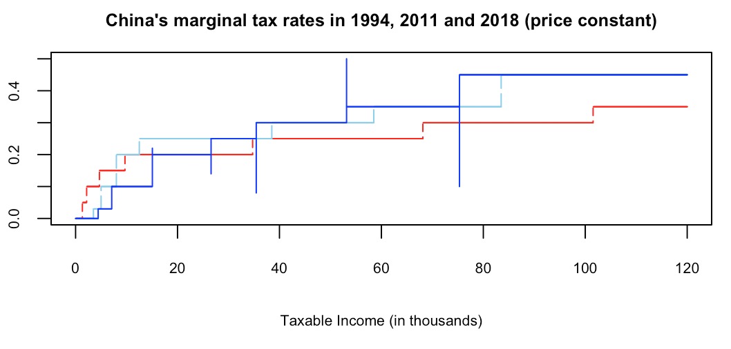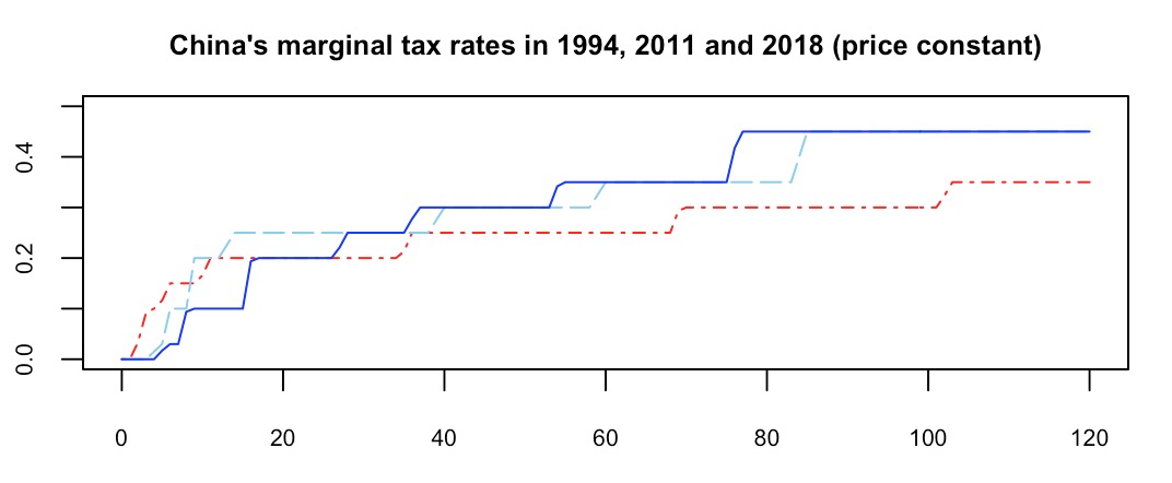 main="China's marginal tax rates in 1994, 2011 and 2018 (price constant)",