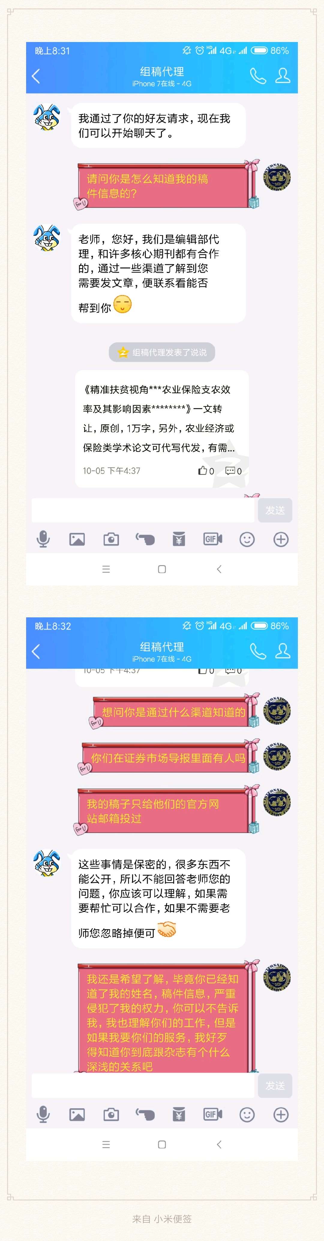 已经工作多年,金融监管总部,平时给杂志投投稿,今天被邮件电话轰炸,发现信息被泄露,他们说的稿子,我只投过一次,就是证券市场导报,9.4投的,至今没消息,然后就发生了这事儿,我尝试套出对方信息,奈何太精,准备投诉深交所纪检部们。
