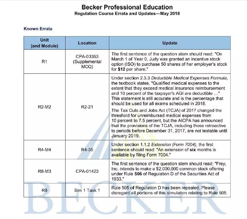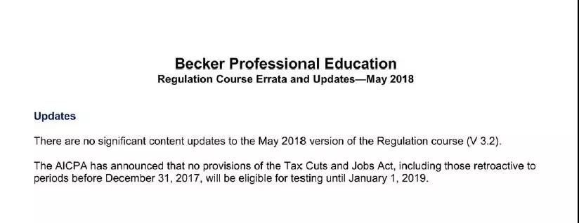 早在今年9月,Becker已提前一个月发布了该条例的更新,让学生有更多的时间熟悉2017年减税和就业法中(Tax Cuts and Jobs Act of 2017)的广泛税法变化。