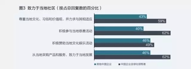 领军者还尊重当地文化并积极投身于当地社区建设。与其他的中国全球化企业相比,领军者更倾向于“尊重当地文化、习俗和价值观,并力求与其相适应”、“积极参与当地慈善活动”、“从当地采购产品和服务,致力于当地发展”以及“积极赞助当地文体娱乐活动”(见图3)。