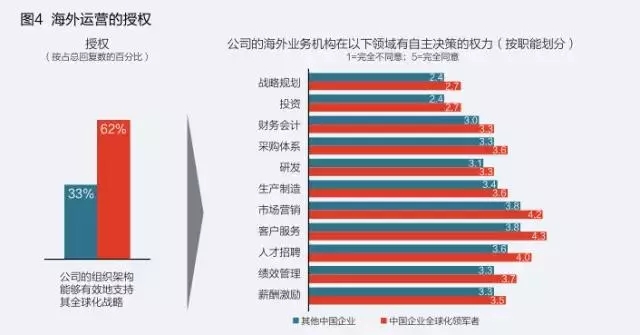 在授权海外业务从而为全球化战略提供支持方面,领军者做得更为出色:近三分之二的领军者认可“企业的组织架构能够为全球化战略提供有效的支持”,相比之下,其他的中国全球化企业认可这一表述的比例不足三分之一。我们对这两类企业的调研结果显示,海外业务的客户服务、市场营销、人才招聘等职能部门有更多的自主决策的权力(见图4) 在这些领域中,当地知识对于成功而言至关重要。