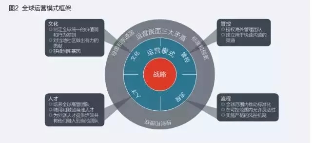 真正使得领军者卓尔不群的,并不完全是全球化的投入或战略,而是执行力,即在全球化进程中系统地应对运营挑战的能力。经过分析这些挑战和领军者的应对方式,我们针对全球运营模式设计了一套研究框架,该框架包含四个重要组成部分:文化、管控、流程和人才(见图2)。
