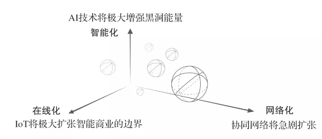 数据智能有着乘法的优势,打个比方,机器的算法在对数据的不断处理过程中,就提升了自己的智能水平。这是7×24永不停歇的自我运转,所以这种学习效应是乘法叠加的。“黑洞”型企业越学越聪明,学得越来越好,越来越快,这就是学习效应。