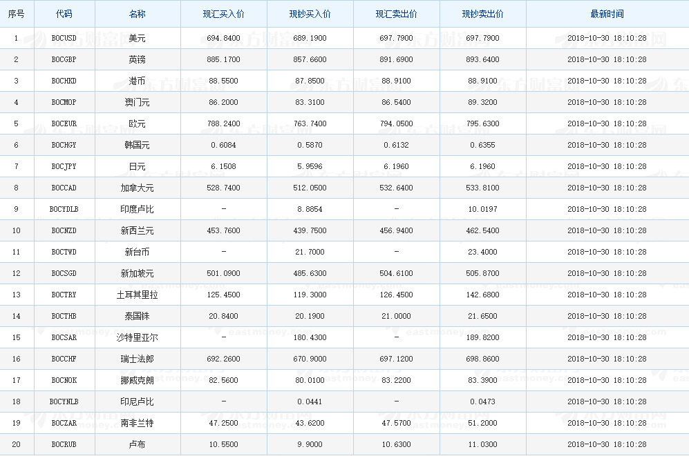 中国银行外汇牌价 2018-10-30(图片来源:东方财富网)