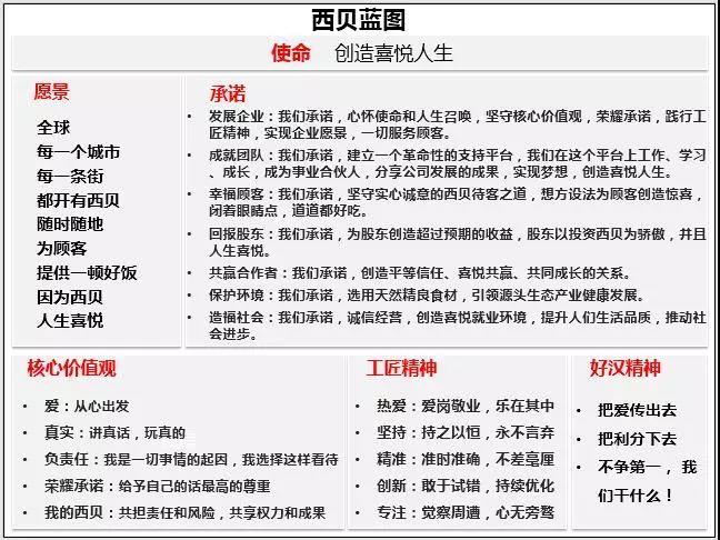 两年前,贾国龙和高管们探讨一个问题:西贝作为餐饮企业,到底人对企业发展的贡献更大?还是资本更大?结论是,人的作用更大。西贝的愿景是:全球每一个城市每一条街都开有西贝,随时随地为顾客提供一顿好饭,因为西贝,人生喜悦。要实现这个愿景,靠钱砸不出来,资本、设备乃至食材都好复制,最难复制的是人——一个个动力十足、训练有素的操心小老板和一线员工。