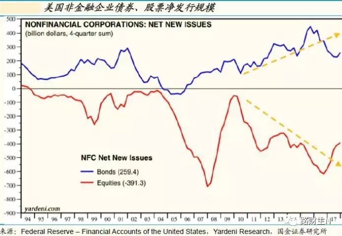 原来,自2008年以来,美联储始终将美元基准利率保持在接近于0的水平,在如此之低的利率水平上——债权融资成本奇低,而2008年金融危机过后,美国上市公司的股价普遍被低估,此时发行股票融资显然不利于现有股东,债权融资才是最好的选择。