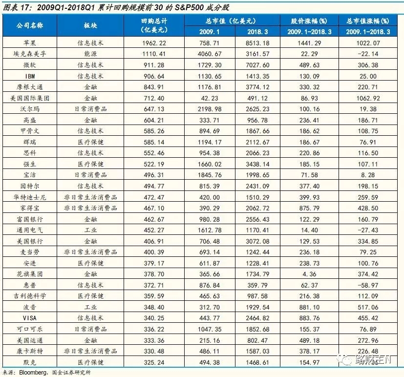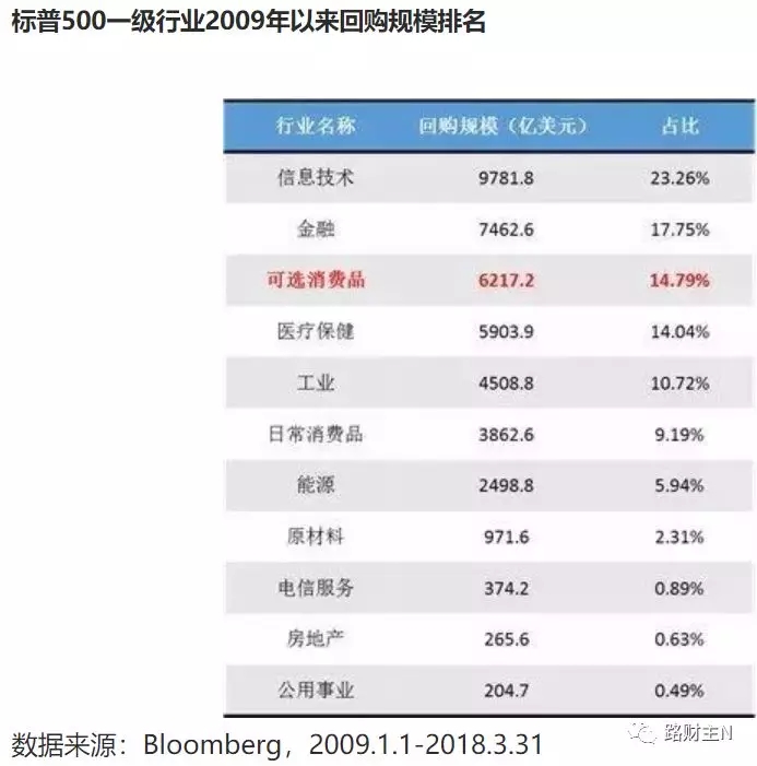就行业来看,2009年1月到2018年3月的统计数据表明,标普500成份股中信息技术、金融和可选消费品版块分列2009年迄今股票回购金额的前三名,而电信服务、房地产和公用事业的回购规模位居最后。