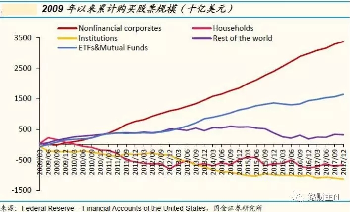 根据美联储数据统计,截止2017年末,美国非金融企业累计购买了3.37万亿美元的股票,而ETF和共同基金累计则购买了1.64万亿美元的股票——相比之下,美国家庭和机构分别净出售了6557亿美元、1.14万亿美元的股票(见下图)。