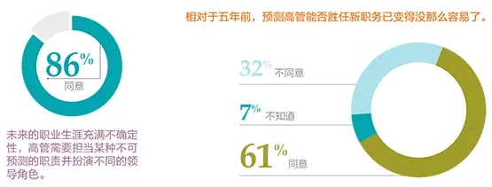 全球受访高管表现出了对未来发展前景的担忧。多数人认为,日益复杂的商业环境严重影响了企业有效识别并培养未来领导的能力。因为企业无法预测,未来领导者应具备怎样的技能。尽管经验在人才战略中仍具有重要的知识作用,但是在企业奠定未来发展基础方面,经验似乎显得并不那么重要。在这次全球调研中,几乎所有的领导人员一致认为,是采用新方式的时候了。他们甚至指出,应该抛弃高绩效等于高潜力的旧有观念,更多地将个人特质作为判定未来高管能否取得成功的最有效指标。