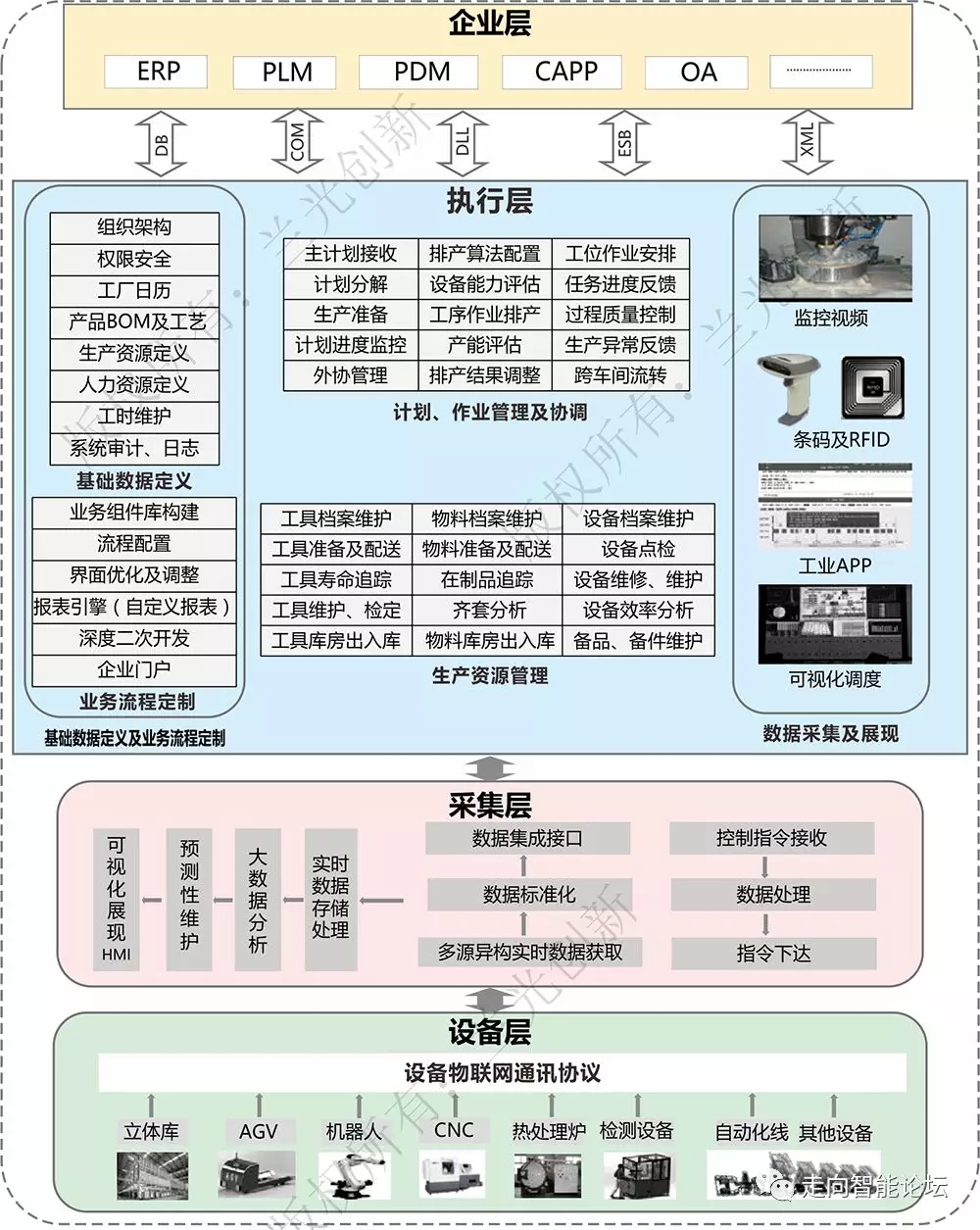 从中可以看到,数字化车间建设有三条主线,一条是以机床、热处理设备、机器人、测量测试设备等组成的自动化设备与相关设施,实现生产过程的精确化执行,这是数字化车间的物理基础。
