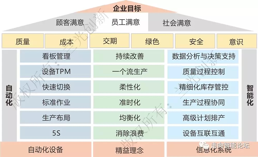 该精益屋以自动化设备、信息化系统为基础,以精益思想为主线,以自働化、智能化(含数字化、网络化)为新时代的支柱,基于5S、生产布局、标准作业、设备TPM等传统精益理念,在设备互联互通、高级计划排产、大数据分析等数字化、网络化、智能化手段的支撑下,实现自动化、智能化、精益化三者的深度融合,并通过智能化手段更好地促进生产过程的均衡化、柔性化、准时化以及实现消除浪费与持续改进,从而确保企业的质量、成本、交期,构建一个客户满意、员工满意、社会满意、充满活力与竞争力的智能化、精益化企业。