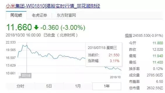 小米今年上市的,如今已经从最高峰下跌46%;市值仅剩2632亿港币,约335亿美元!