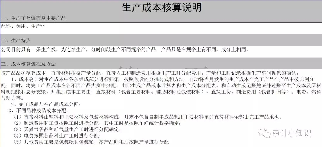 二、了解被审计单位的生产工艺流程和成本核算方法,检查成本核算方法与生产工艺流程是否匹配,前后期是否一致,并作出记录。