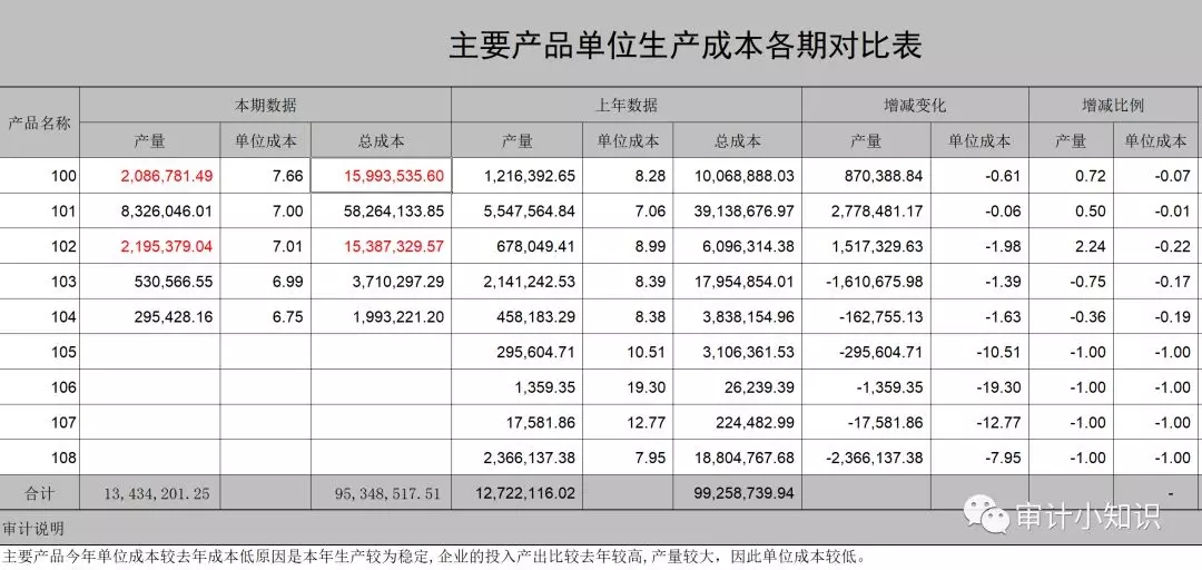 一般生产性企业可以根据企业的财务核算,审计人员通过 EXCEL 表格编制企业主要产品的单耗表,可以较清晰比较各月及前后期同一产品的单位成本、前后各期及本年度各个月份的生产成本项目以及当年度及以前年度直接材料、直接人工、制造费用占生产成本的比例,以确定异常情况并查明异常原因。