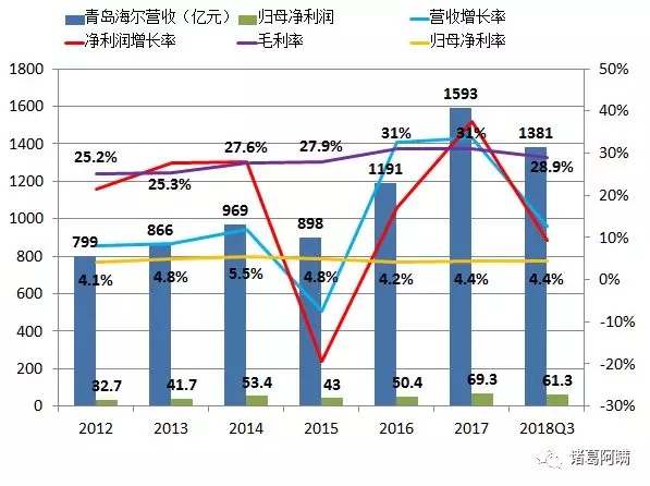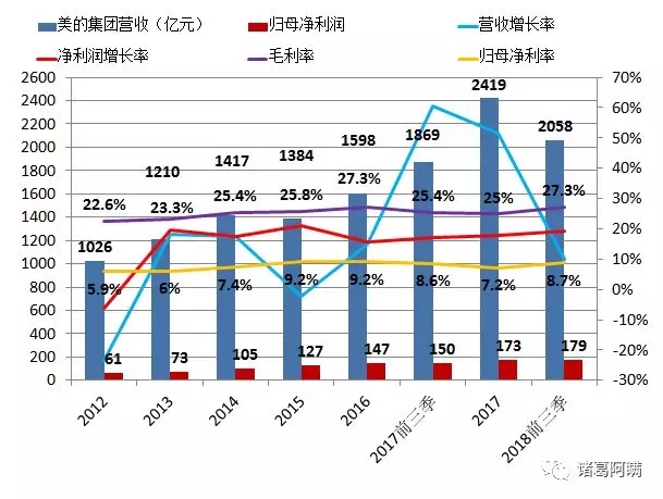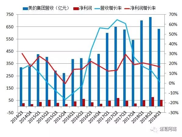2018年,美的集团前三季度营收首次超过2000亿为2058亿元,同比增长10.1%,归母净利润179亿元+19.4%,已超过2017年全年业绩。其中第三季度实现营收631亿元,仅增长1%,归母净利润49.6亿元,同比增长18.6%。