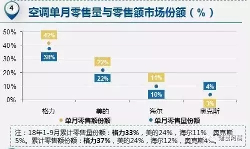 产业在线数据显示,2018年第三季度空调内销233万台,同比下滑12.6%,出口923万台同比+1.4%,需求依然低迷。根据中怡康零售数据,2018年前三季度,格力空调仍然以33%的销量占有率位居第一,但销量同比下滑6%,销售额下滑1%。