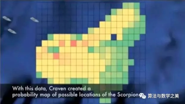 最后,Craven得到了一张20英里海域的概率图。整个海域被划分成了很多个小格子,每个小格子有两个概率值p和q,p是潜艇躺在这个格子里的概率,q是如果潜艇在这个格子里,它被搜索到的概率。