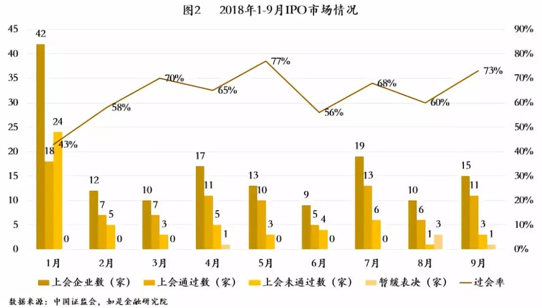 随着2018年第三季度的结束,成立于2017年9月底,有着史上最严发审委之称的第十七届发审委任期届满。其上任以来A股IPO市场发生了很大变化,其中包括严格审核进入常态化,过会率创出历史新低,困扰市场多年的IPO“堰塞湖”问题渐退等。第十七届发审委任期共计审核了232家IPO企业(不含取消审核),140家企业通过审核,87家企业被否,整体过会率仅为60.3%,其中2018年上半年整体过会率仅为56.31%,第三季度过会率有所提升,为68.18%。2018年1月至9月底期间,中企A股IPO市场大幅放缓,累计过会企业家数为87家,同比下降75.14%,新股数量月均仅为9.67只。受此影响,总募资规模也出现了一定下滑,但前三季度总募资额1154.23亿元,仅较去年同期的1758.33亿元下滑34.36%。故平均来看,新股质量有所提升,平均募资规模出现明显增长,由去年的平均募资额5.01亿元升至今年的13.27亿元,扩大了2.64倍。