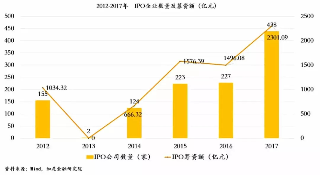 为了改变堰塞湖的局面,从2014年IPO重启以来,政策层就一直在推动加快IPO。从2014年重启到2015年股灾前,IPO伴随着市场的上涨一路攀升,IPO数量几乎与市场同步见顶,这个阶段主要政策导向是缓解资产荒,推动股权融资稳增长。2015年股灾导致IPO短暂暂停4个月,到2015年底又再度重启,然后IPO慢慢开始回升,尤其是从2016年下半年开始明显加速,A股IPO进入2.0时代,也被称之为“IPO新常态”。与之前最大的区别在于速度,中国这轮速度上与美国趋同,某些月份甚至超过美国市场注册制IPO数量。2017年全年IPO数量高达438家,刷新历史纪录。上会企业平均排队时间从年初的1.76年下降到年底的1.31年,过会率高达79.3%。这个阶段的主要导向是加快IPO,缓解堰塞湖压力,拓宽企业融资渠道。