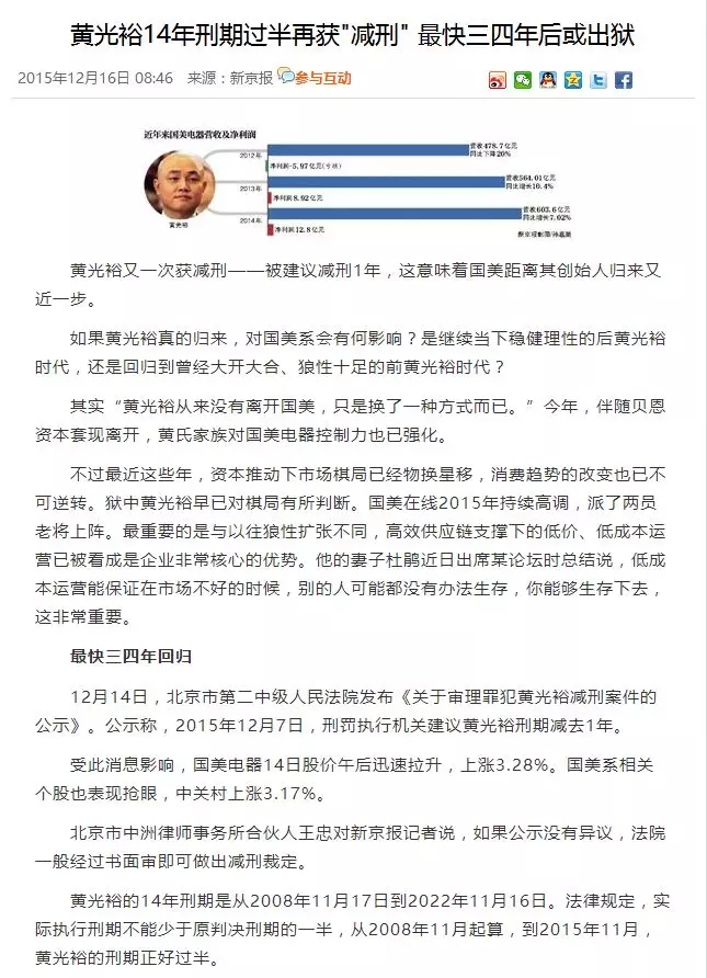 但可惜好景不长。2008年11月,黄光裕因涉嫌商业犯罪被拘,后来被判有期徒刑14年。据说在狱中表现良好,是一个改造的积极分子,获得了几次减刑。算起来,再过两年就要出狱了。
