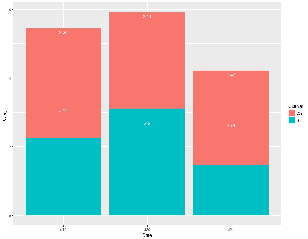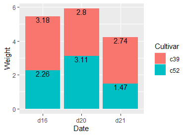 ce<-ddply(ce,"Date",transform,label_y=cumsum(Weight))> ce Cultivar Date Weight sd n se label_y1 c39 d16 3.18 0.9566144 10 0.30250803 3.182 c52 d16 2.26 0.4452215 10 0.14079141 5.443 c39 d20 2.80 0.2788867 10 0.08819171 2.804 c52 d20 3.11 0.7908505 10 0.25008887 5.915 c39 d21 2.74 0.9834181 10 0.31098410 2.746 c52 d21 1.47 0.2110819 10 0.06674995 4.21