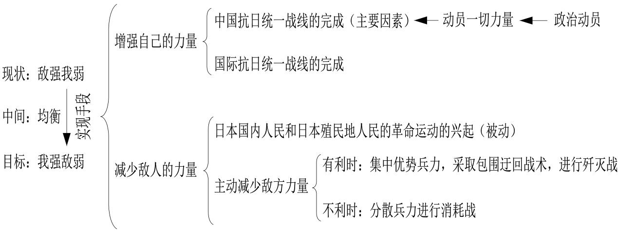 减少敌人的力量有两种,一种是日本国内人民和日本殖民地人民的革命运动的兴起,这是一种被动的手段;一种是我方主动采取手段使其减少,手段又包含两种,一种是有利的时刻集中优势兵力,采取包围迂回战术,进行歼灭战,从而减少敌人的力量;另一种是不利的时刻,分散兵力进行消耗战,从而蚕食敌人的力量。通过较长时间的积累,我方的力量逐渐增强,敌人的力量逐渐减弱,从敌强我弱到力量均衡,最后达到我强敌弱的状态,此时进行决战,战胜敌人。