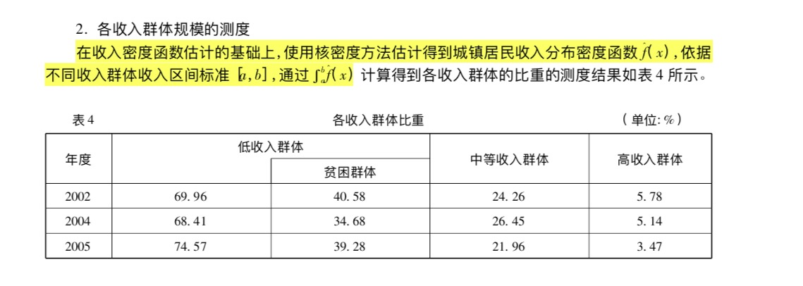 看到很多关于估算中等收入群体人口比重的论文,首先是通过核密度估计得到收入密度函数,通过收入密度函数去估计某一收入区间的人口比重。文章中对于如何求解人口比重都是一带而过,没有具体的说,我看得云里雾里的。。我知道通过密度函数求解比重是看对应区间的密度函数图的“面积”,但stata中核密度估计我只知道可以通过kdensity画图,但是不知道怎么通过stata求出人口比重啊。。就像图里的那种。。求赐教啊!!具体的论文在附件里,麻烦各位了!