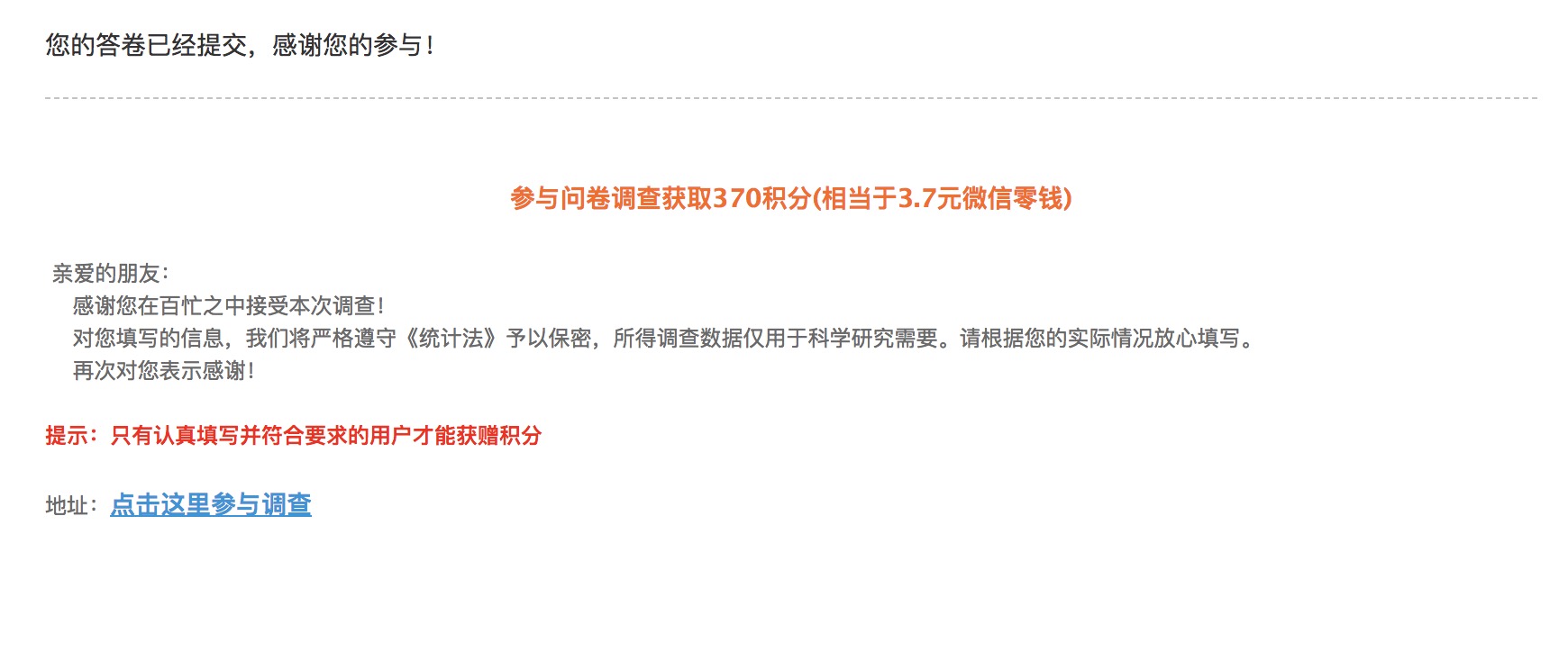 Joey桃子 发表于 2018-11-5 00:47 这是一份关于B2C电子商务平台忠诚度的问卷,共40个问题,填写大概需要3-5分钟, 因为写论文需要收集数 ...