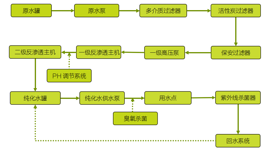 1、工艺流程:高档不锈钢水箱→原水加压泵→自动多介质过滤器→自动活性炭过滤器→(自动软水器)→精密过滤器→第一级反渗透 →PH调节→高档纯水箱→第二级反渗透→无菌纯化水箱→纯水泵→臭氧杀菌系统→紫外线杀菌器→ 微孔过滤器→用水点