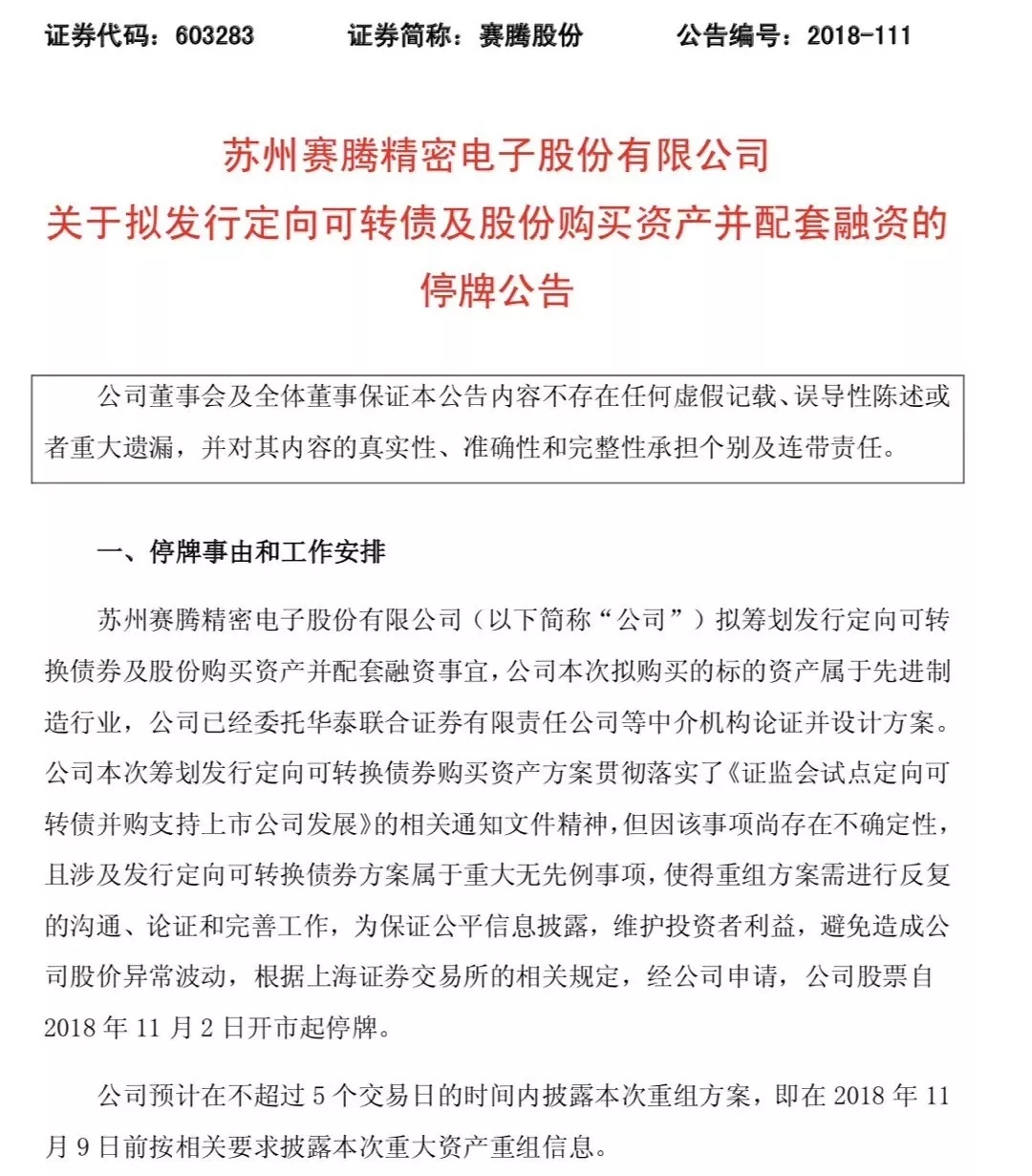 在证监会推出政策后第二天一早,赛腾股份就发布公告拟发行定向可转债及股份购买资产并配套融资,祝贺老东家华泰联合抢得试点第一单,继续在并购重组领域引领创新。静候5个交易日内的具体方案。
