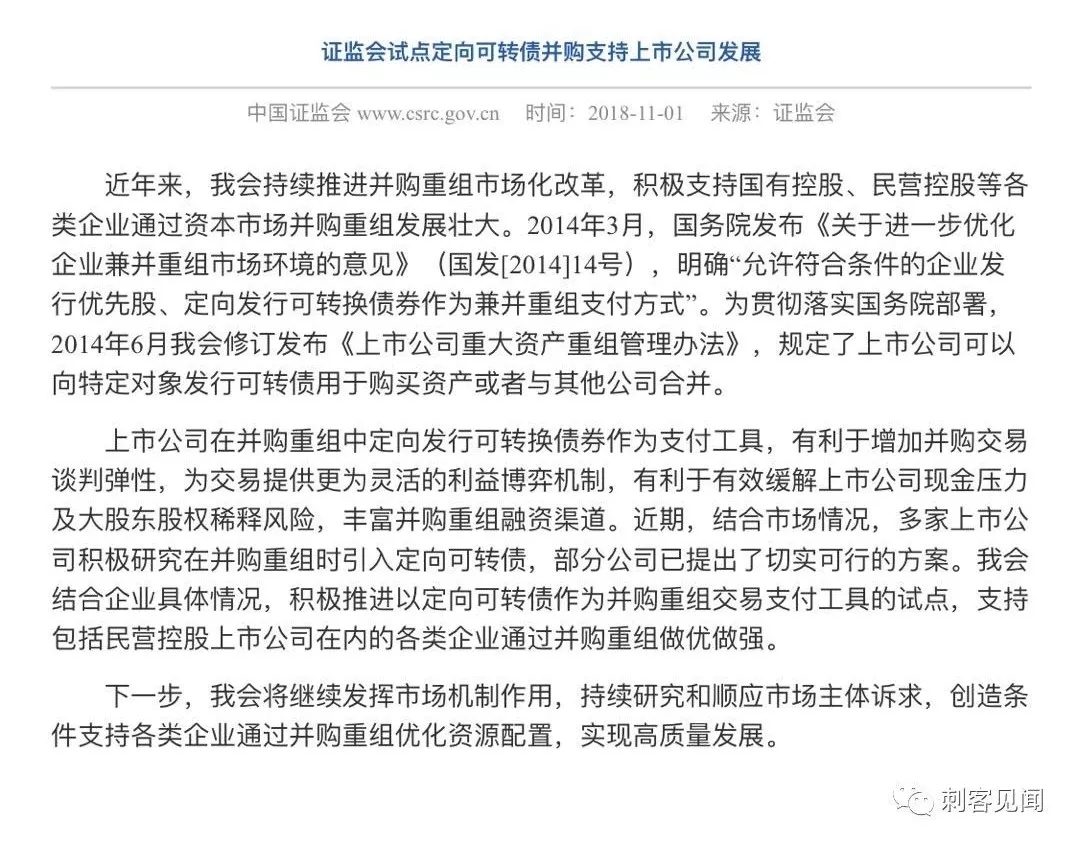 2018年11月1日晚,证监会网站上挂出一条公告:《证监会试点定向可转债并购支持上市公司发展》。